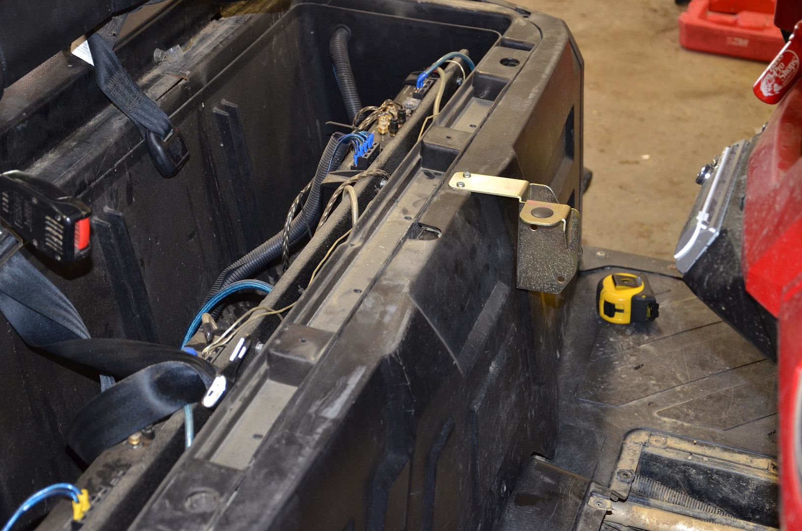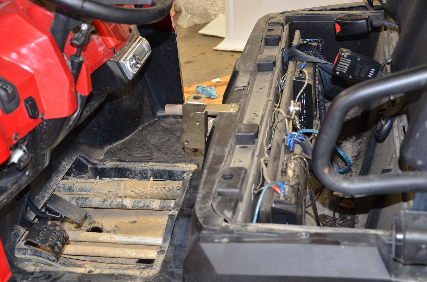Next, it was time to install the PTO control joystick. The Joystick mounts on the front seat frame of the Ranger Crew. Once a comfortable location is determined, the mounting bracket for the joystick is installed with some carriage bolts. There is drilling required for the mounting holes.