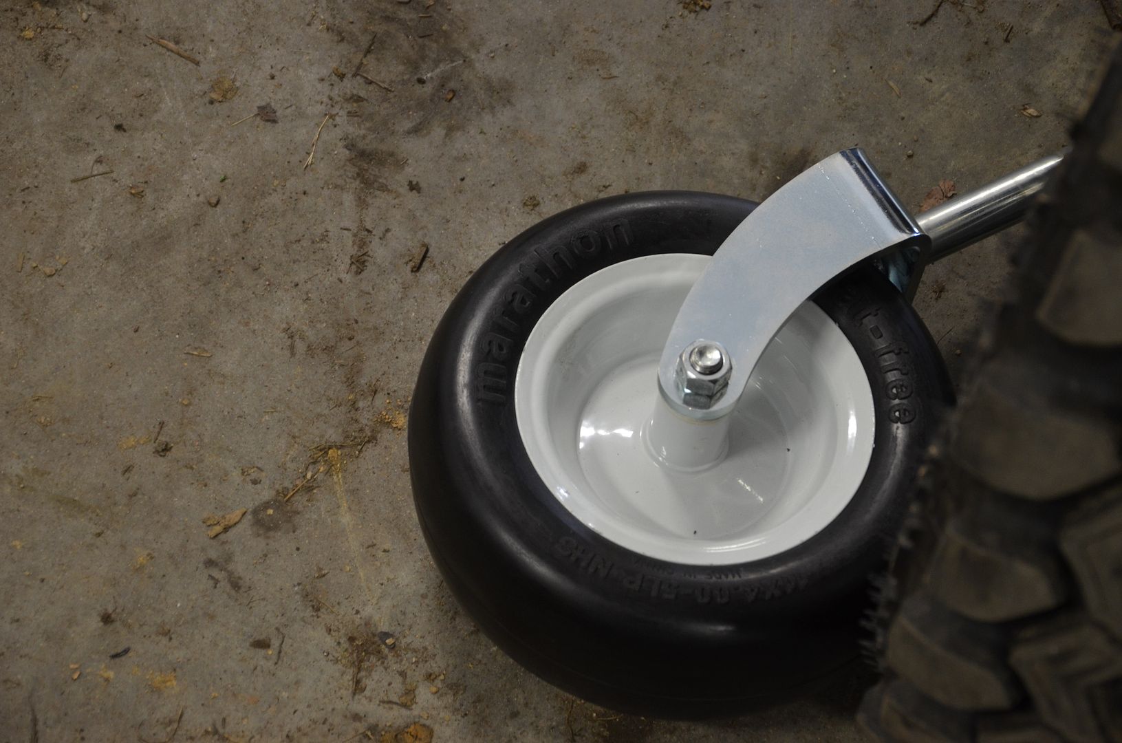The Proman Rough Cut Mower Deck rides on (4) run-flat castor wheels. These wheels are built very heavy. In addition, the pivot housing has a grease zerk so they can be lubricated.